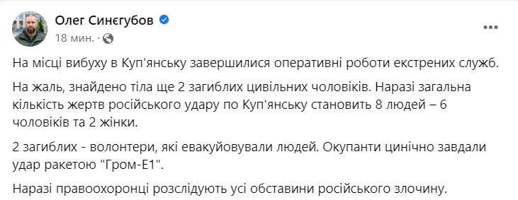 "К сожалению, найдены тела еще 2 погибших гражданских мужчин. Общее количество жертв российского удара по Купянску составляет 8 человек – 6 мужчин и 2 женщины", - написал Синегубов.