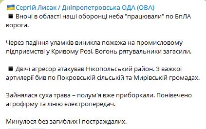 Ночью из-западения обломков сбитого российского дрона возник пожар на промышленном предприятии в Кривом Роге.