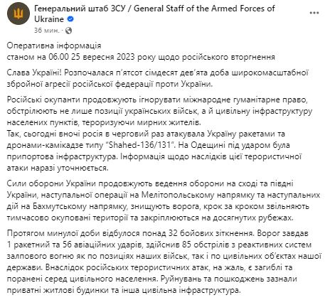 Генштаб ВСУ обнародовал сводку наутро 25 сентября.