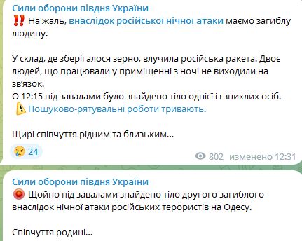В Одессе под завалами нашли тела двух погибших в результате ночной атаки РФ. Оба погибших работали на зернохранилище.