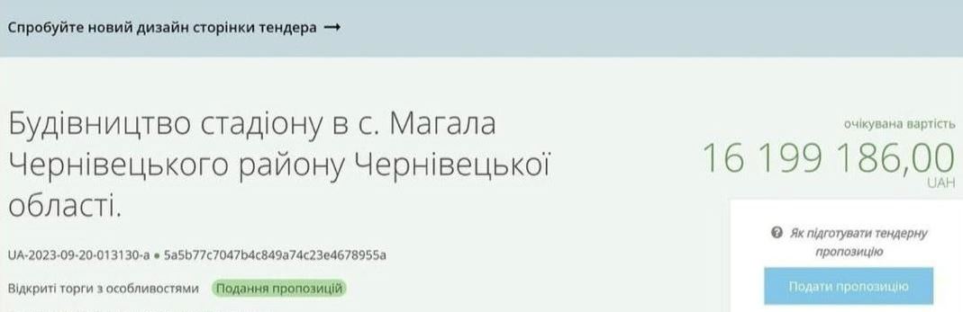 Согласно этим данным, 16 млн гривен планируют потратить местные власти на стадион в селе Магала Черновицкой области (30 километров от Румынской границы). Население села, согласно Википедии - 2500 человек.