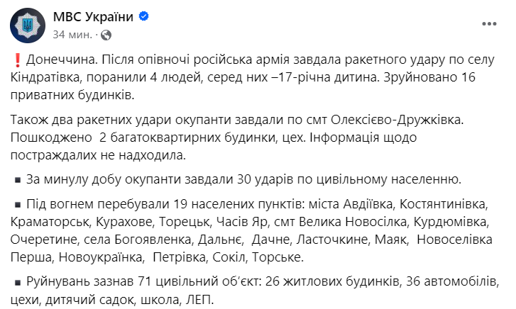"После полуночи российская армия нанесла ракетный удар по селу Кондратовка. Ранены 4 человека, среди них – 17-летний ребенок. Разрушены 16 частных домов", - говорится в сообщении.