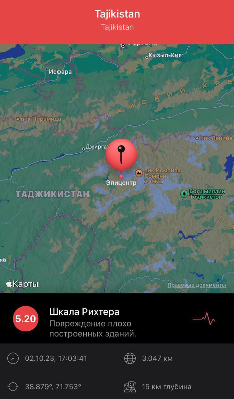В Таджикистане произошло землетрясение магнитудой 5,2. Карта