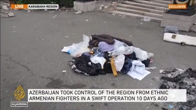 На кадрах телеканала Al Jazeera из Степанакерта видна пустая центральная площадь, заваленная мусором, брошенными детскими колясками и самокатами.