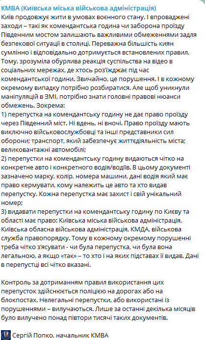 При этом он сообщил, что пропуск, разрешающий находиться на улице в комендантский час, не дает права проезда через Южный мост - ни днем, ни ночью. Ездить там могут только военнослужащие и другие представители сил обороны, а также транспорт, обеспечивающий жизнедеятельность города, и большегрузные автомобили.