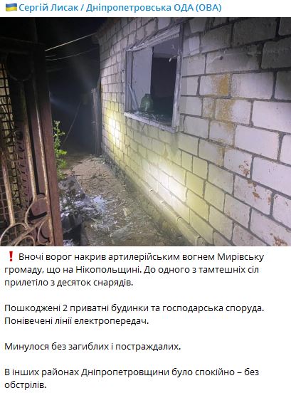 Ночью, 4 октября, россияне накрыли артиллерийским огнем Мировскую громаду Никопольского района Днепропетровской области.
