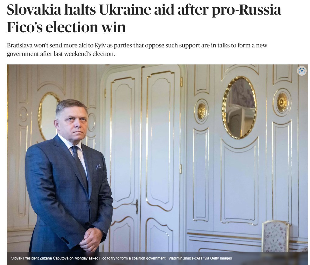 "Братислава не будет отправлять больше помощи Киеву, поскольку партии, выступающие против такой поддержки, ведут переговоры о формировании нового правительства после выборов, состоявшихся в минувшие выходные", - заявил представитель кабинета, которого цитирует Politico.