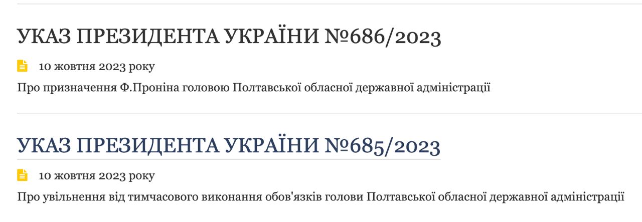 Вторым указом Зеленский назначил на место Лунина Филиппа Пронина. Ранее Пронин был заместителем главы Агентства по розыску и менеджменту активов (АРМА). А до этого работал на государственной службе, налоговым и финансовым аналитиком в частном секторе. Также новый глава Полтавской ОВА был главным специалистом Департамента аналитической работы в Государственном комитете финансового мониторинга и Государственной службе финансового мониторинга.