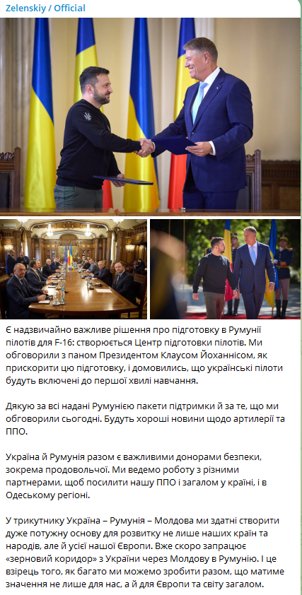 Ранее Зеленский заявил, что украинские пилоты будут обучаться на F-16 в Румынии.