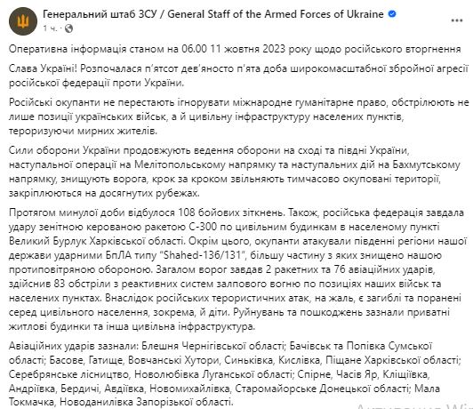 РФ нанесла удар зенитной управляемой ракетой С-300 по гражданским домам в населенном пункте Большой Бурлук Харьковской области. Атаковала южные регионы беспилотниками. Всего враг нанес 2 ракетных и 76 авиационных ударов, совершил 83 обстрела из РСЗО.
