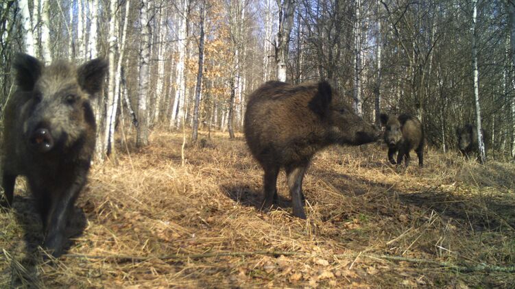 Чернобыльский радиационно-экологический биосферный заповедник показал снимок кабанов, сделанный фотоловушкой проекта "Полесье - дикая природа без границ". Такие камеры установлены на территории зоны отчуждения ЧАЭС.