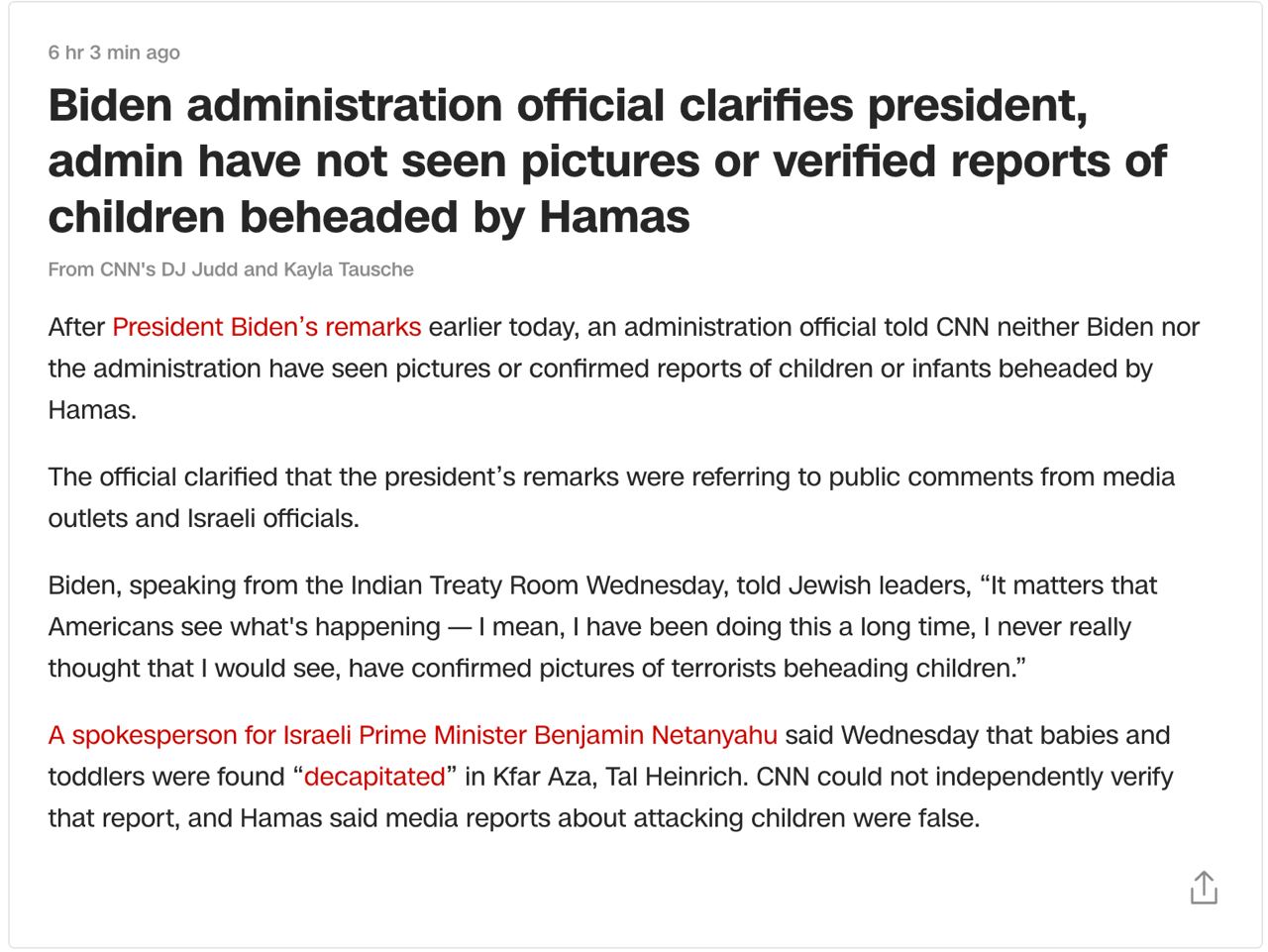 Но представитель Белого дома сообщил CNN, что ни Байден, ни сотрудники его администрации не видели подобных снимков или подтвержденной информации об обезглавленных членами ХАМАС детям.