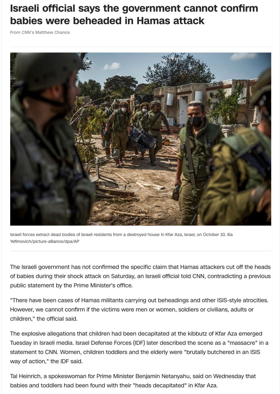 Также CNN опубликовал еще одну новость на эту тему со ссылкой на источник в израильском правительстве, который не подтвердил инциденты с массовым обезглавливанием детей.