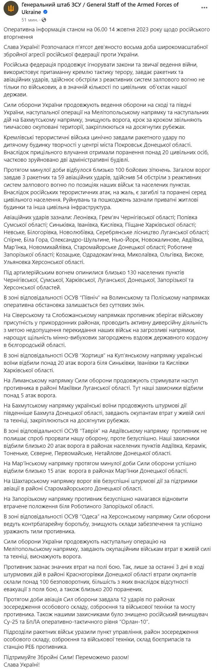 В субботу, 14 октября, в Украине идет 598-й день войны с Россией.