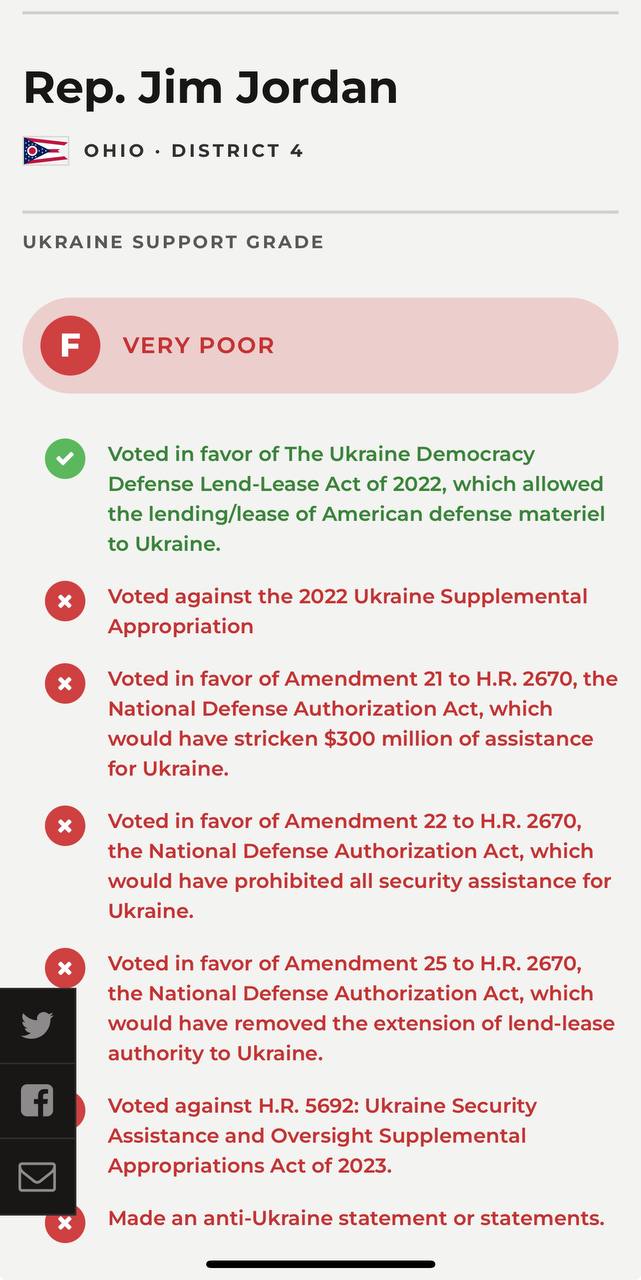 В трекере, который отслеживает уровень поддержки Украины со стороны конгрессменов, Джордан имеет рейтинг "очень плохо".