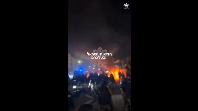 На кадрах заполненная возбуждённой толпой улица, на заднем плане которой видно горящее здание. Видны флаги Палестины, слышны крики "Аллах Акбар!"