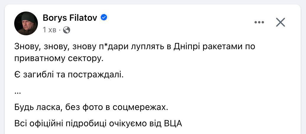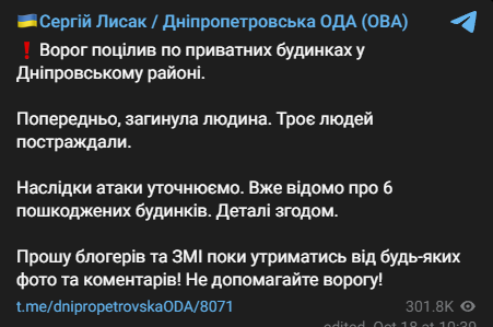 "Враг попал по частным домам в Днепровском районе. Предварительно, погиб человек. Три человека пострадали. Последствия атаки уточняем. Уже известно о шести поврежденных домах. Детали позже", - написал глава Днепропетровской областной военной администрации Сергей Лысак.