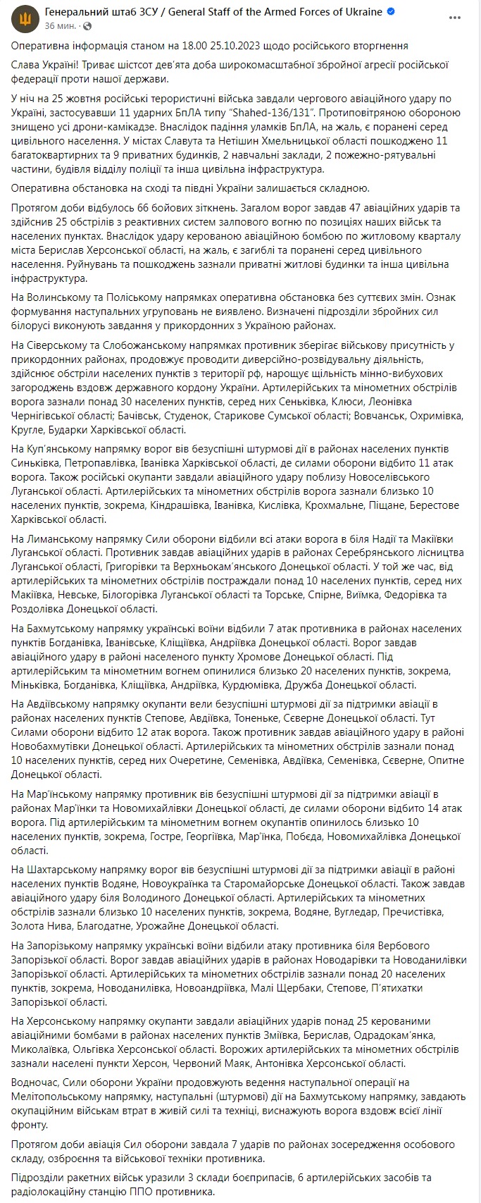 Генштаб ВСУ опубликовал оперативную информацию о ситуации на фронте по состоянию на 18:00 25 октября.