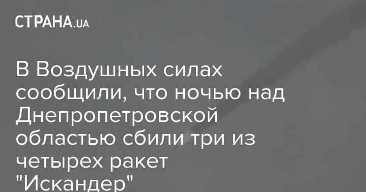 В Воздушных силах сообщили, что ночью над Днепропетровской областью сбили три из четырех ракет "Искандер"