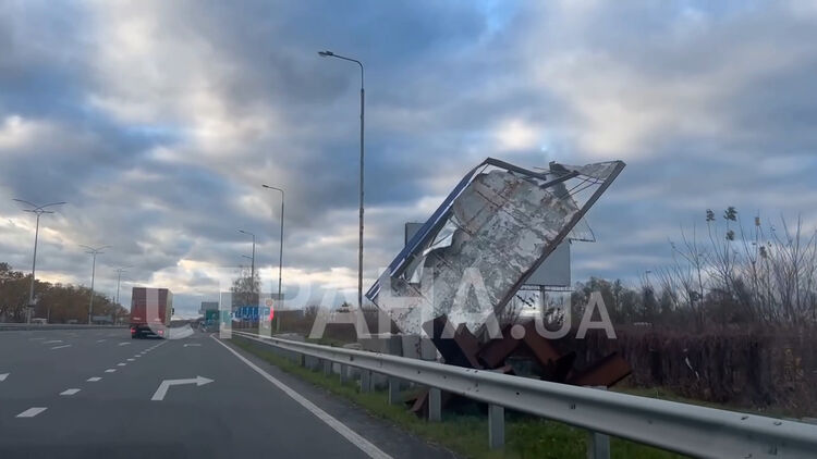 В субботу, 28 октября, штормовой ветер над Украиной сломал деревья в Киеве и снёс рекламный щит на Бориспольской трассе.