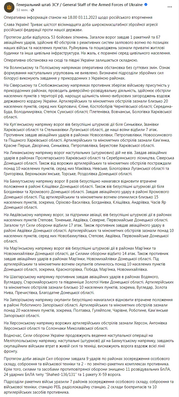 Генштаб ВСУ опубликовал оперативную информацию о ситуации на фронте по состоянию на 18:00 3 ноября.