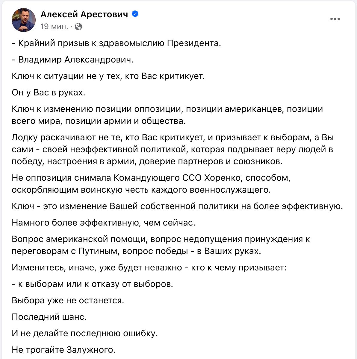 "Ключ — это изменение Вашей собственной политики на более эффективную. Намного более эффективную, чем сейчас. Вопрос американской помощи, вопрос недопущения принуждения к переговорам с Путиным, вопрос победы - в Ваших руках. Изменитесь, иначе, уже будет неважно - кто к чему призывает: к выборам или к отказу от выборов. Выбора уже не останется. Последний шанс. И не делайте последнюю ошибку. Не трогайте Залужного", — сказал Алексей Арестович.