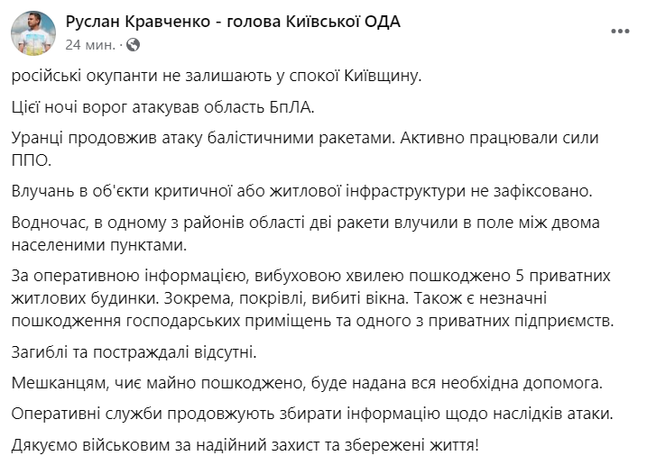 Напомним, по предварительной информации, Киевскую область атаковали баллистической ракетой. В Воздушных силах сообщили, что сигнал воздушной тревоги сработал с опозданием из-за скорости ракеты. Силы ПВО отразили атаку.