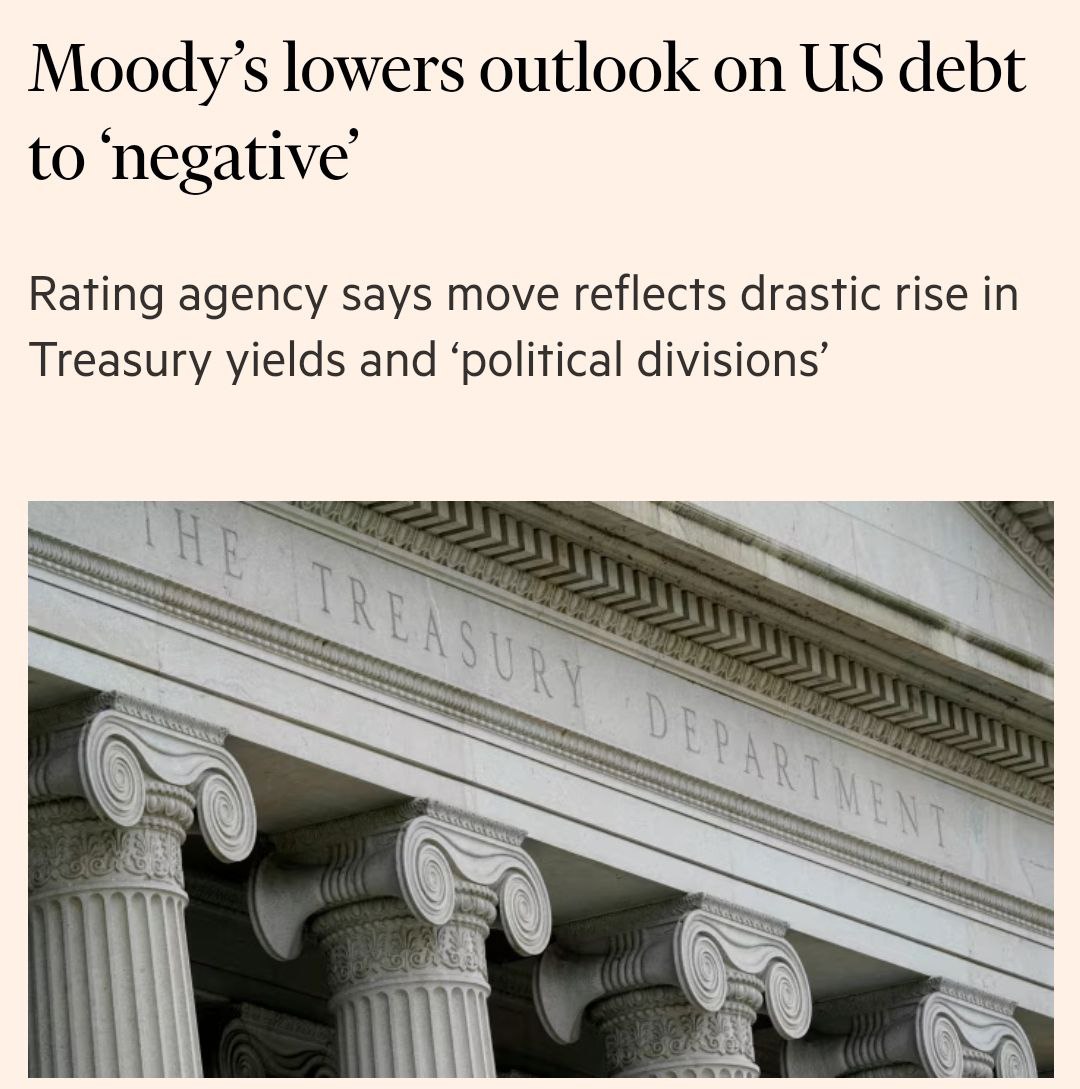 Причины - резкий рост затрат на обслуживание долга (доходность облигаций США накануне выросла из-за роста ключевой ставки) и "укоренившаяся политическая поляризация".
