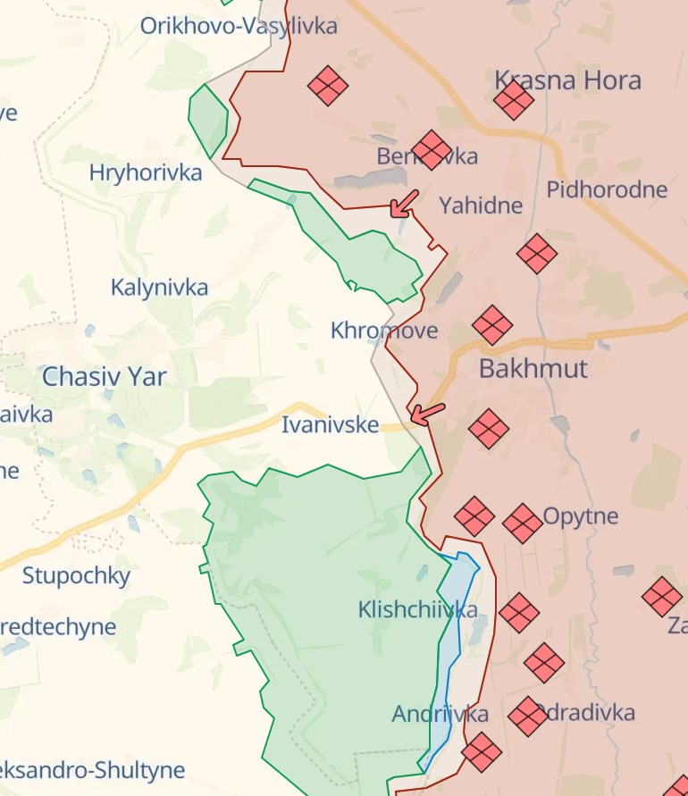 Ранее на этой неделе российские паблики заявляли о продвижении своих войск в районе Клещеевки к югу от Бахмута. Украина этого не подтверждала.