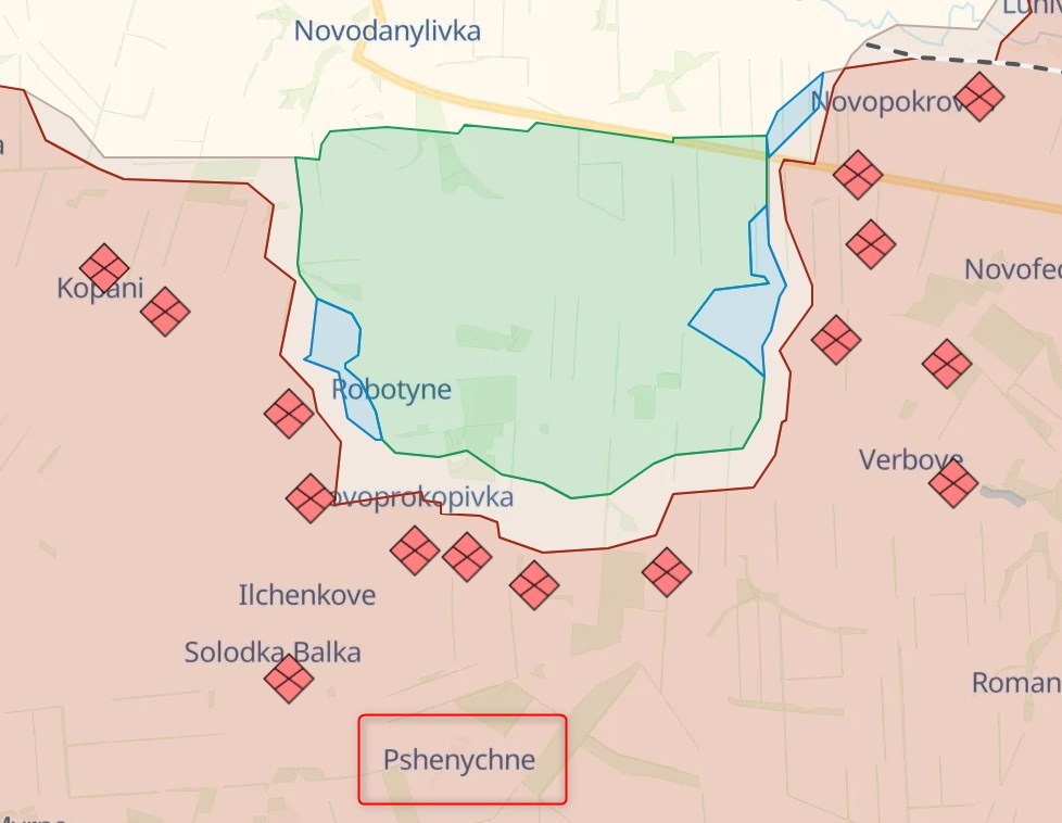 Россияне подтверждают атаку ВСУ в районе Новопрокоповки, а также сообщают о наступлении Украины на село Пшеничное, расположенное южнее - видимо, туда двинулись, обойдя Новопрокоповку с востока.