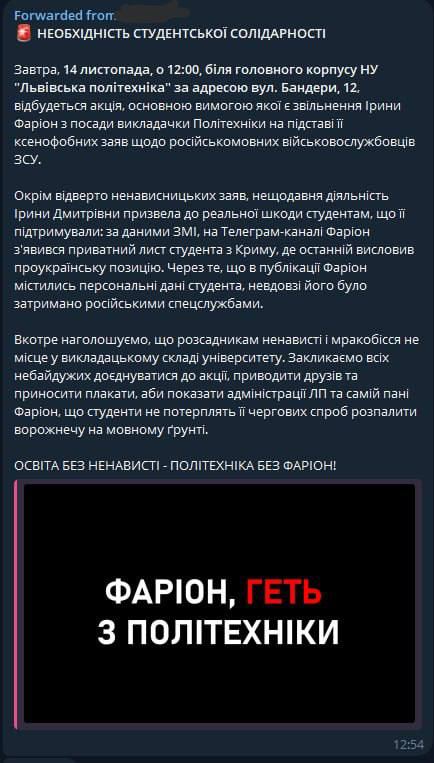 "В очередной раз подчеркиваем, что рассадникам ненависти и мракобесия не место в преподавательском составе университета. Призываем всех неравнодушных присоединяться к акции, приводить друзей и приносить плакаты, чтобы показать администрации ЛП и самой госпоже Фарион, что студенты не потерпят ее очередных попыток разжечь вражду на языковой почве".