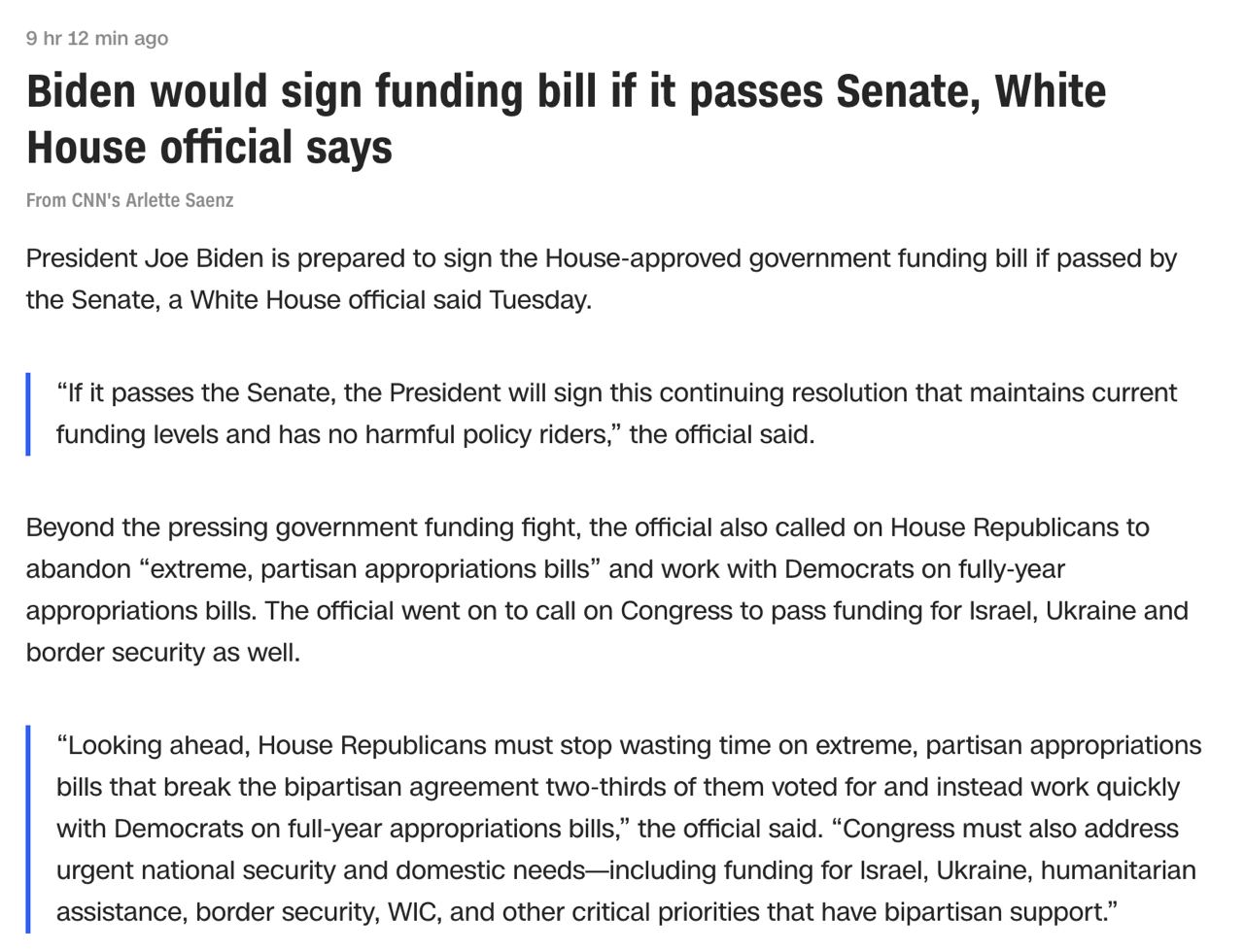 Президент США Джо Байден подпишет принятый Палатой представителей бюджет о временном финансировании правительства без выделения денег Украине, если он будет одобрен Сенатом.