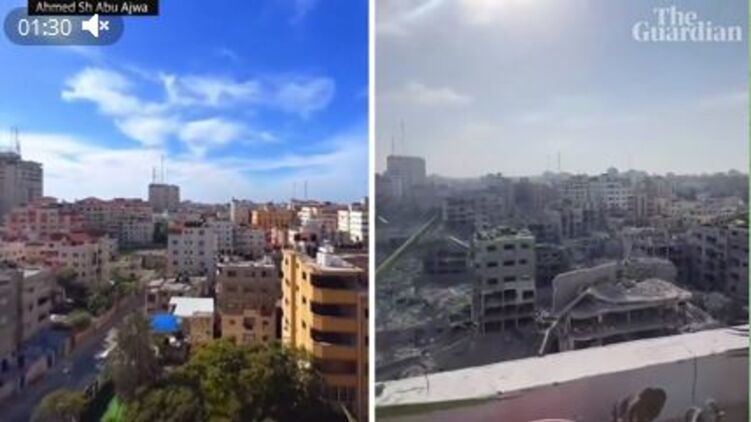 На кадрах издание сравнило картинку с одного из балконов высотного дома в Газе, снятую до военных действий, с видом с этого же балкона после массированных ударов по Газе в рамках борьбы Израиля с ХАМАС.