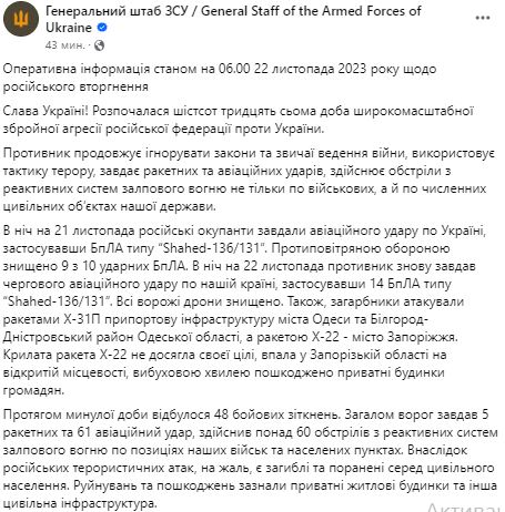 В ночь на 22 ноября противник нанес очередной авиационный удар, применив 14 БпЛА типа "Shahed-136/131". Все вражеские дроны уничтожены. Также захватчики атаковали ракетами Х-31П припортовую инфраструктуру города Одессы и Белгород-Днестровский район Одесской области, а ракетой Х-22 - город Запорожье. Крылатая ракета Х-22 не достигла своей цели, упала в Запорожской области на открытой местности, взрывной волной повреждены частные дома граждан.