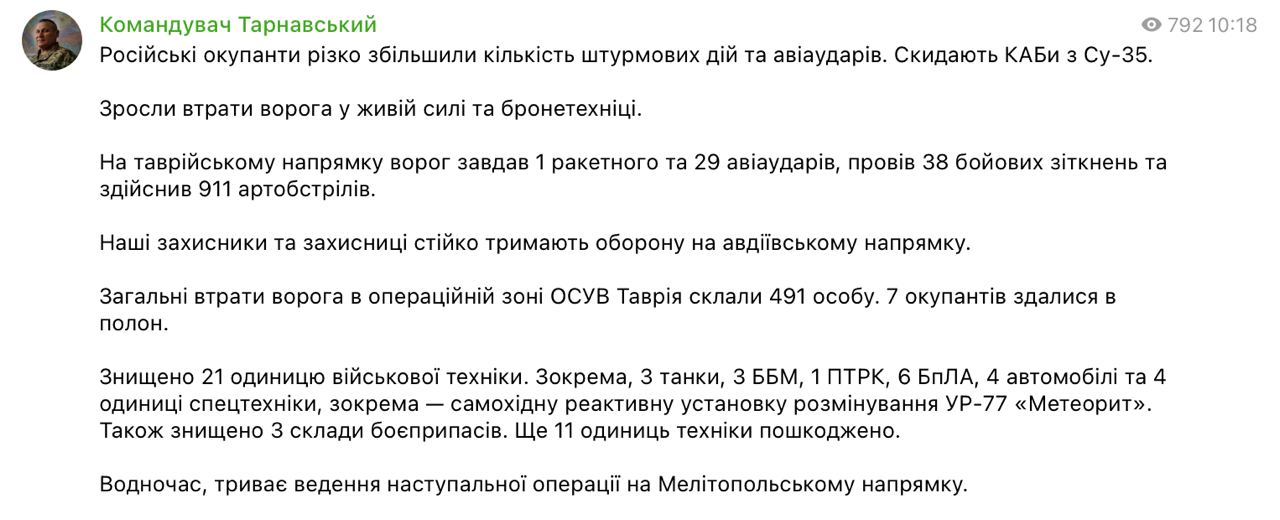 Военные РФ увеличили количество штурмовых действий и авиационных ударов на таврическом направлении (Запорожская область и юг Донецкой). Сбрасывают управляемые авиационные бомбы из Су-35.