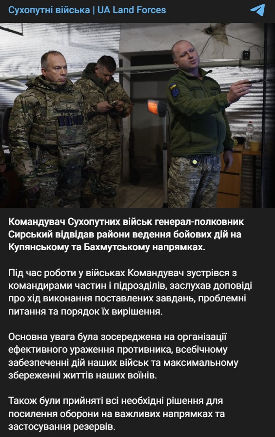 Командующий Сухопутными войсками генерал-полковник Сырский посетил позиции ВСУ на Купянском и Бахмутском направлениях.