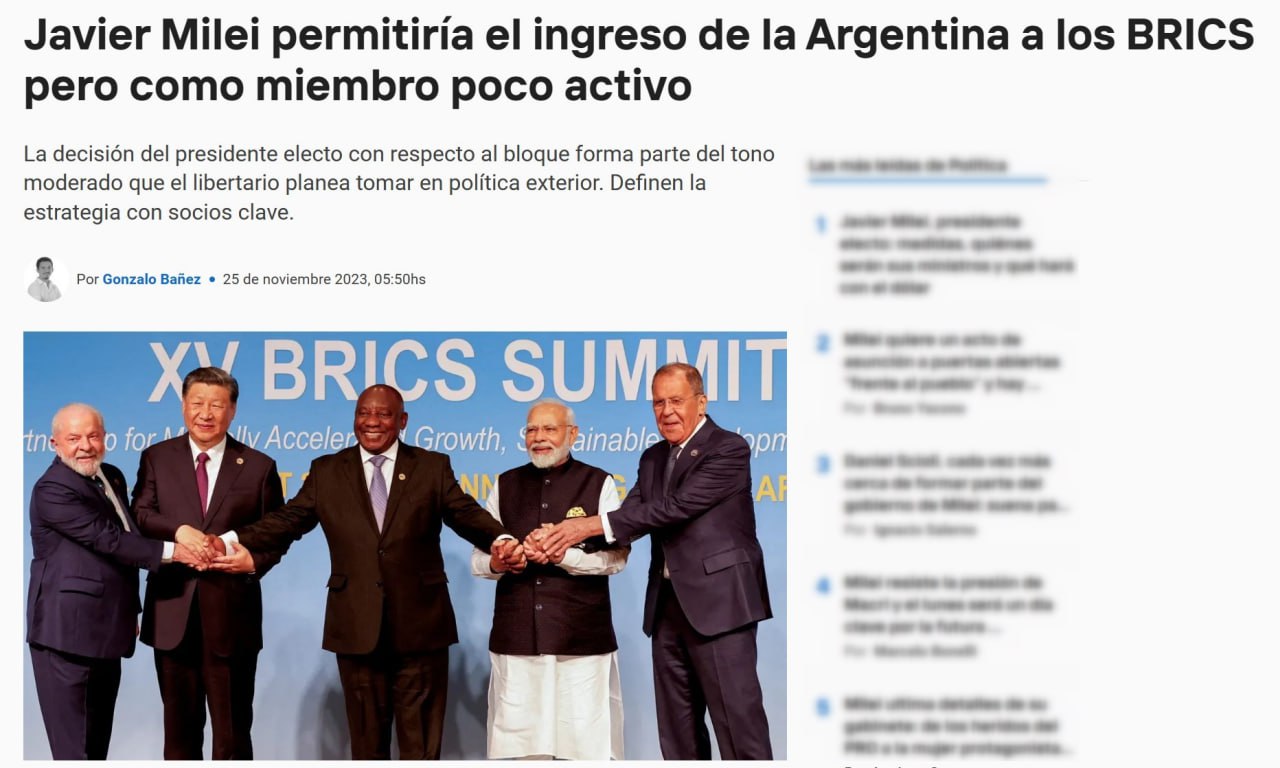 В августе Хавьер Милей заявлял, что будущее Аргентины с Израилем и США. Но теперь "либертарианец начал проявлять признаки умеренности своей речи, когда дело касается внешней политики, особенно в отношении Китая, Бразилии и БРИКС".