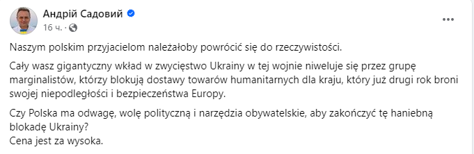 "Наши польские друзья должны вернуться к реальности. Весь ваш гигантский вклад в победу Украины в этой войне сводится на нет группой маргиналов, блокирующих гуманитарные поставки в страну, которая уже второй год отстаивает свою независимость и безопасность Европы.