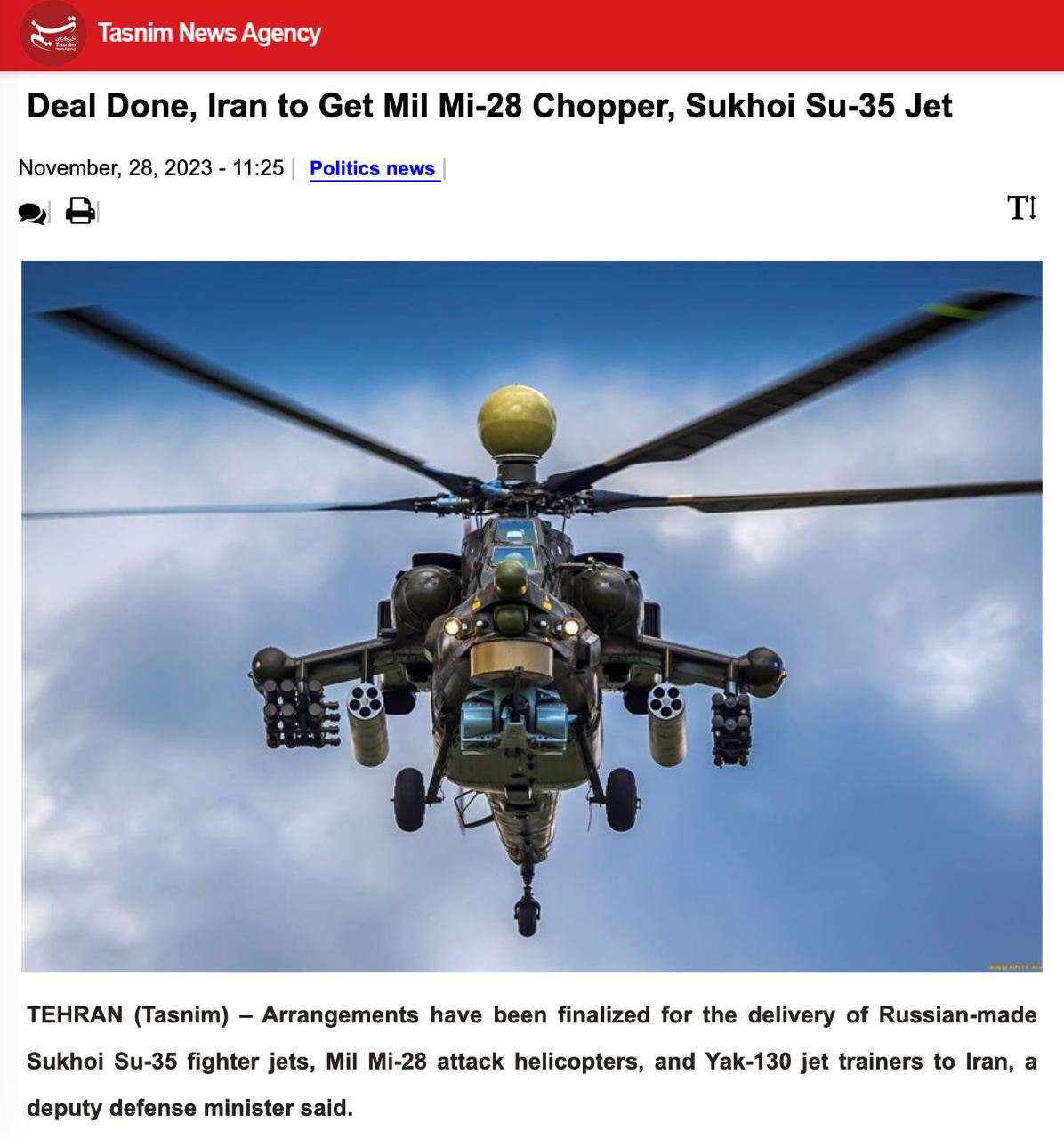 11.35 Тегеран и Москва договорились о поставке в Иран российских истребителей Су-35, ударных вертолетов Ми-28 и учебно-тренировочных самолетов Як-130.