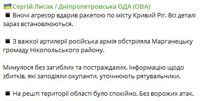 07.30 Ночью РФ ударила ракетой при Кривому Рогу. Последствия уточняются.