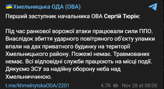 "Во время утренней вражеской атаки работали силы ПВО. В результате сбития ударного воздушного объекта обломки упали на крышу частного дома на территории Хмельницкого района. Пожара нет. Травмированных нет", - написал он.