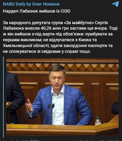 Народный депутат Сергей Лабазюк из группы "За будущее" вышел из следственного изолятор, уплатив залог в размере 40 миллионов гривен.