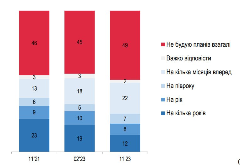Количество людей, которые не готовы строить планы на ближайшее время, увеличилось по сравнению с довоенным периодом с 46 до 49%.