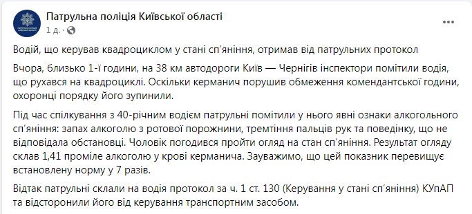 Мужчину остановили, так как он нарушил комендантский час. Во время общения с ним патрульные заметили у него явные признаки опьянения: запах алкоголя изо рта, дрожание пальцев рук и странное поведение. Мужчина согласился пройти осмотр на опьянение, драгер показал у него в крови 1,41 промилле. Этот показатель превышает норму в 7 раз.