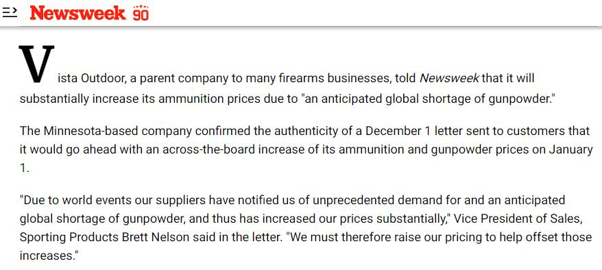 "В связи с мировыми событиями наши поставщики уведомили нас о беспрецедентном спросе и ожидаемой глобальной нехватке пороха, и, таким образом, существенно увеличили наши цены", — сообщил в письме вице-президент по продажам Sporting Products Бретт Нельсон.