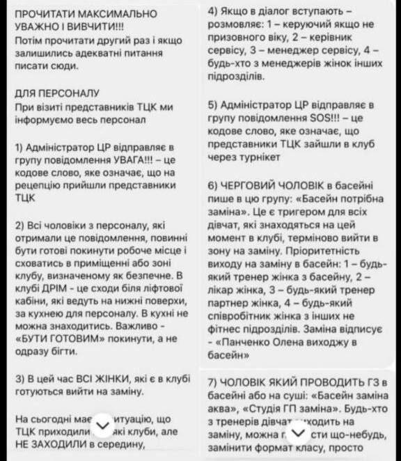 Кроме того, рекомендуется вступать в диалог с военкомами управляющему, если он не подлежит мобилизации по возрасту, или менеджерам-женщинам, а также использовать кодовые слова, предупреждающие о пути продвижения по спортклубу сотрудников ТЦК.