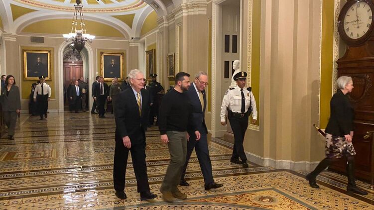 На кадрах из здания Конгресса видно, что Зеленского сопровождают лидеры демократической и республиканской фракций в сенате Чак Шумер и Митч Макконнелл.
