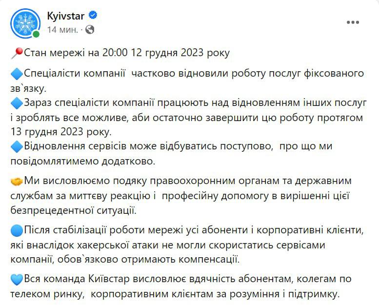 Работа сервисов "Киевстар" будет возобновляться постепенно, о чём оператор будет уведомлять по мере их доступности.