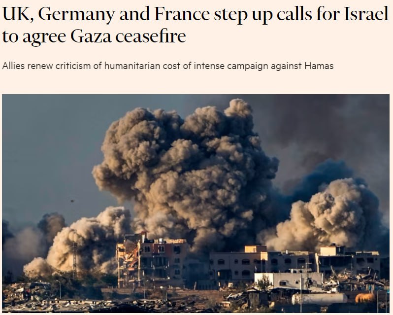 Главы МИД Великобритании, Германии и Франции потребовали от Израиля прекратить огонь в секторе Газа из-за растущих жертв и гуманитарного кризиса.