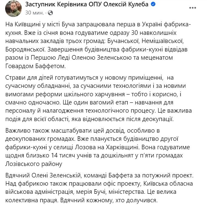 Об этом сообщает заместитель главы Офиса президента Украины Алексей Кулеба, который посетил завершение строительства фабрики-кухни вместе с Первой Леди Еленой Зеленской и меценатом Говардом Баффетом.